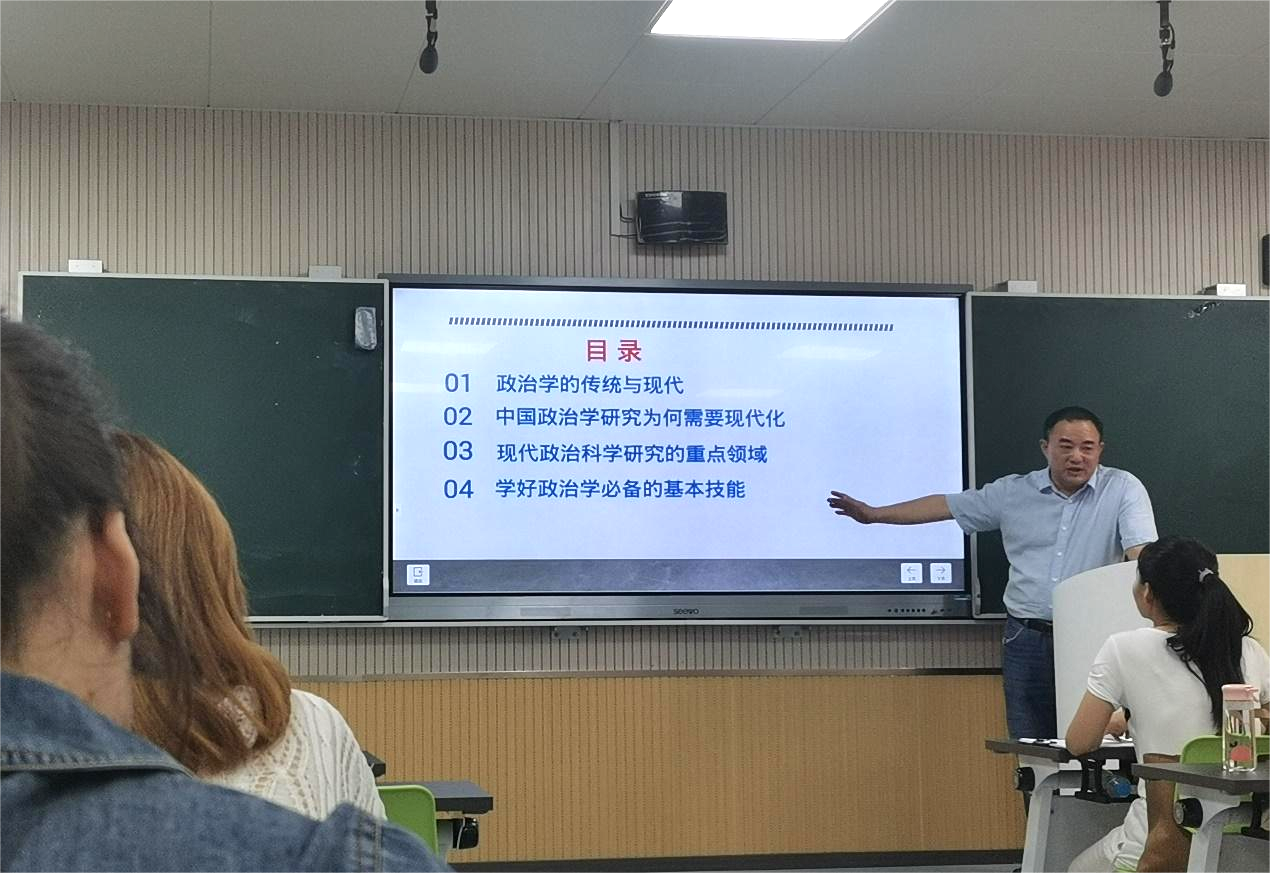 第二环节,侯学华进行经理第一课。他首先向新生们介绍了中国政治学研究的系统逻辑,对新旧制度主义进行了比较,介绍了新旧制度主义的研究方法,强调了比较研究、结构—功能主义、科学行为主义、系统论理论四种新制度研究方法,指出这种历史转向是必然的。其次,强调了政治现代化的研究重点,例如注重实际,结合现实进行研究,指出政治学不只是一门针对国家学说、政治理论、政治制度、政治思想、政治现象比较的人文科学。最后总结了如何更好地实现政治现代化,对研究生新生提出了多阅读、多调查,提高人际沟通能力等要求,希望新生们能度过充实的三年研究生生活。